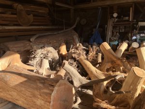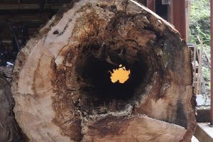 「”森のヘンテコ素材”に出会う旅2025」と題して、一般的な木材流通ではほぼ見かけない、穴あきの”でか丸太”や根っこ、樹皮剥きの枝、シワシワ・ボコボコの丸太など、ちょっとヘンな素材を展示します。