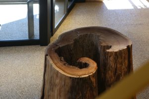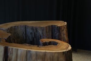 中心が腐食のため空洞化、倒木の危険があるため伐採されたが、市場に流通する丸太にはない躍動感溢れる形状を生み出している