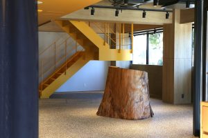 エントランスに置かれた高さ1400mm、直径1000mmのスギ丸太(サイズは概数)。大きすぎたため2パーツに分けて搬入、接着後、ラッシングベルトで固定